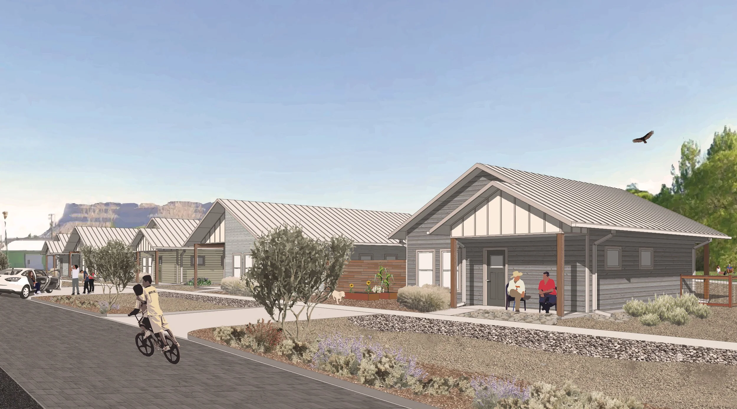 Canal Commons is a new parkside neighborhood along the historic canal in Green River, Utah being developed by Epicenter Properties, LLC. These much-needed homes have been sized for local development team capacity with a focus on high quality design, affordability, energy efficiency, and accessibility. This project also features the old town park restored as Pearl Baker Park, with natural playscapes, outdoor classrooms, and shaded picnic areas among a tall grove of cottonwood trees.